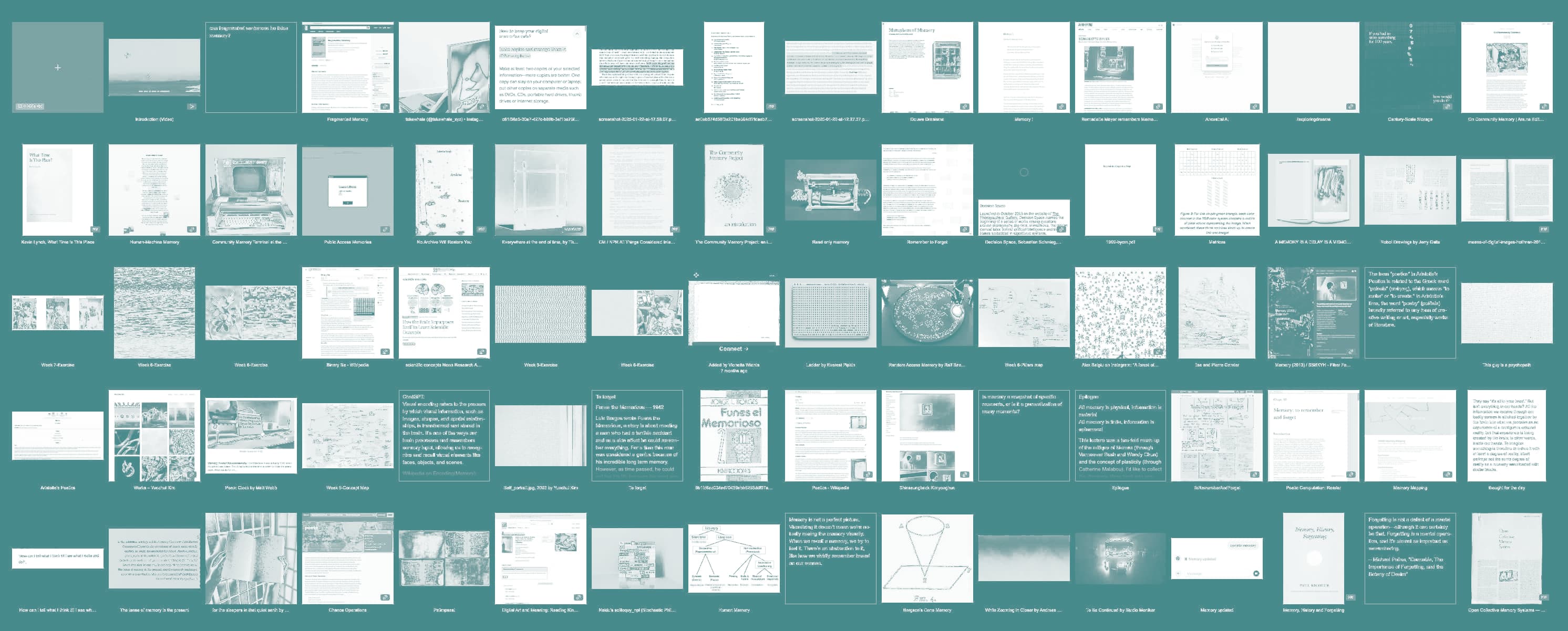 Below are selections of resources that guided my research on exploring the intersection of human and machine memory. The repository contains books, essays, and projects that have inspired my work throughout the whole semesters. Take a look at my are.na page to see the full repository.