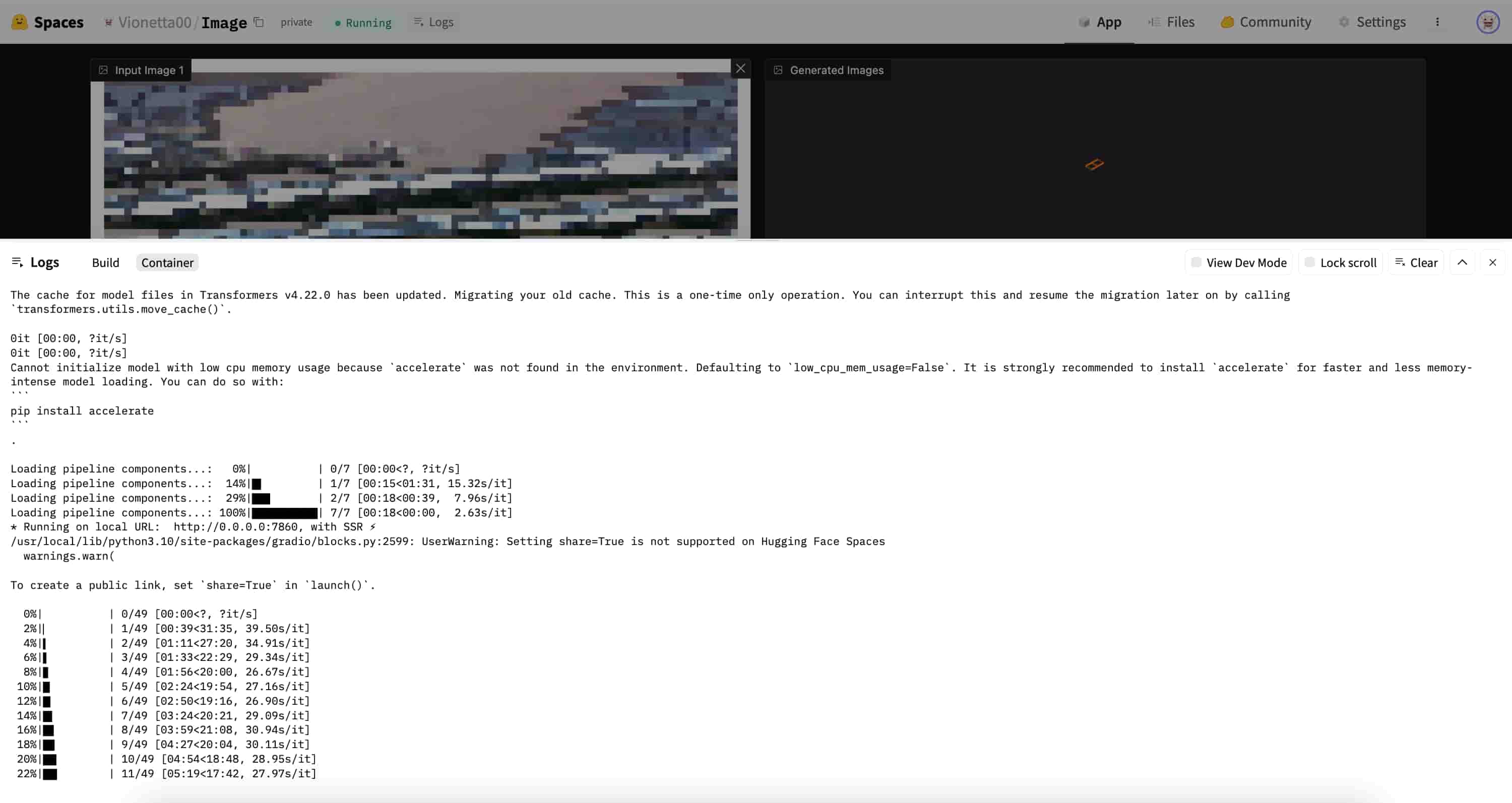 Firstly, I may not read the instructions well and left some few sources out. I mean ChatGPT is smart but I was relying on it too much. Secondly, It works once, but it took at least 5 minutes to produce one image, and the result was not even a proper interpolation (it just showed a blank image). Thirdly, after a consultation I had with Jake at school, he told me that if I wanted to use the pre-trained model for visual explorations, Hugging Face was not it.