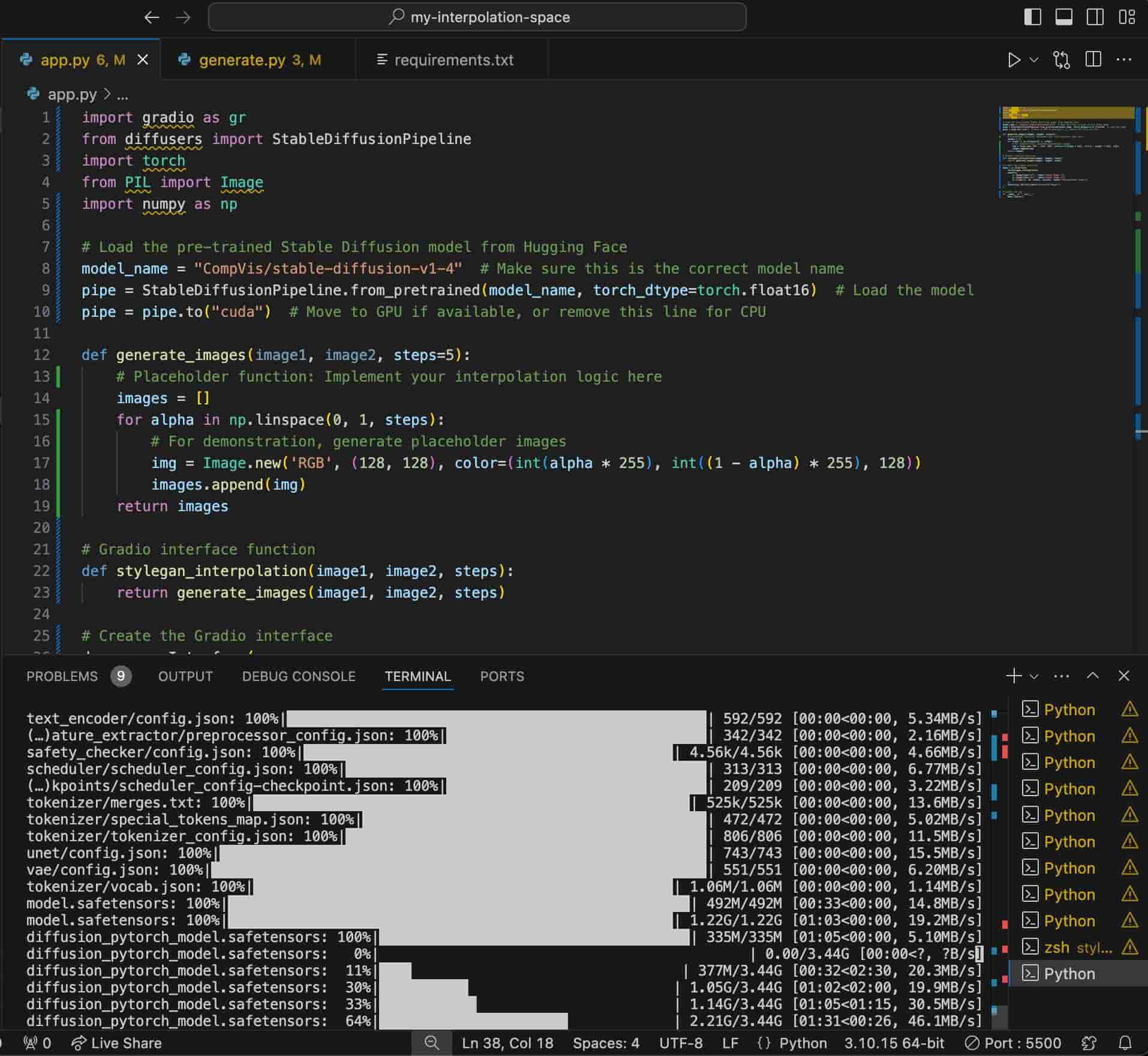 I started my first sketch in Visual Studio Code and connect the sketch code using python to deploy it to Gradio on Hugging Face. After having some fights with ChatGPT about why the code is not working (most of the reasons were because I kept on using a different version of python, which was completely my bad), I finally managed to deploy the demo of the stable diffusion model I sourced on Hugging Face. The app ended up running on the platform, however, the interpolation didn't quite work when I uploaded the image into the app...
