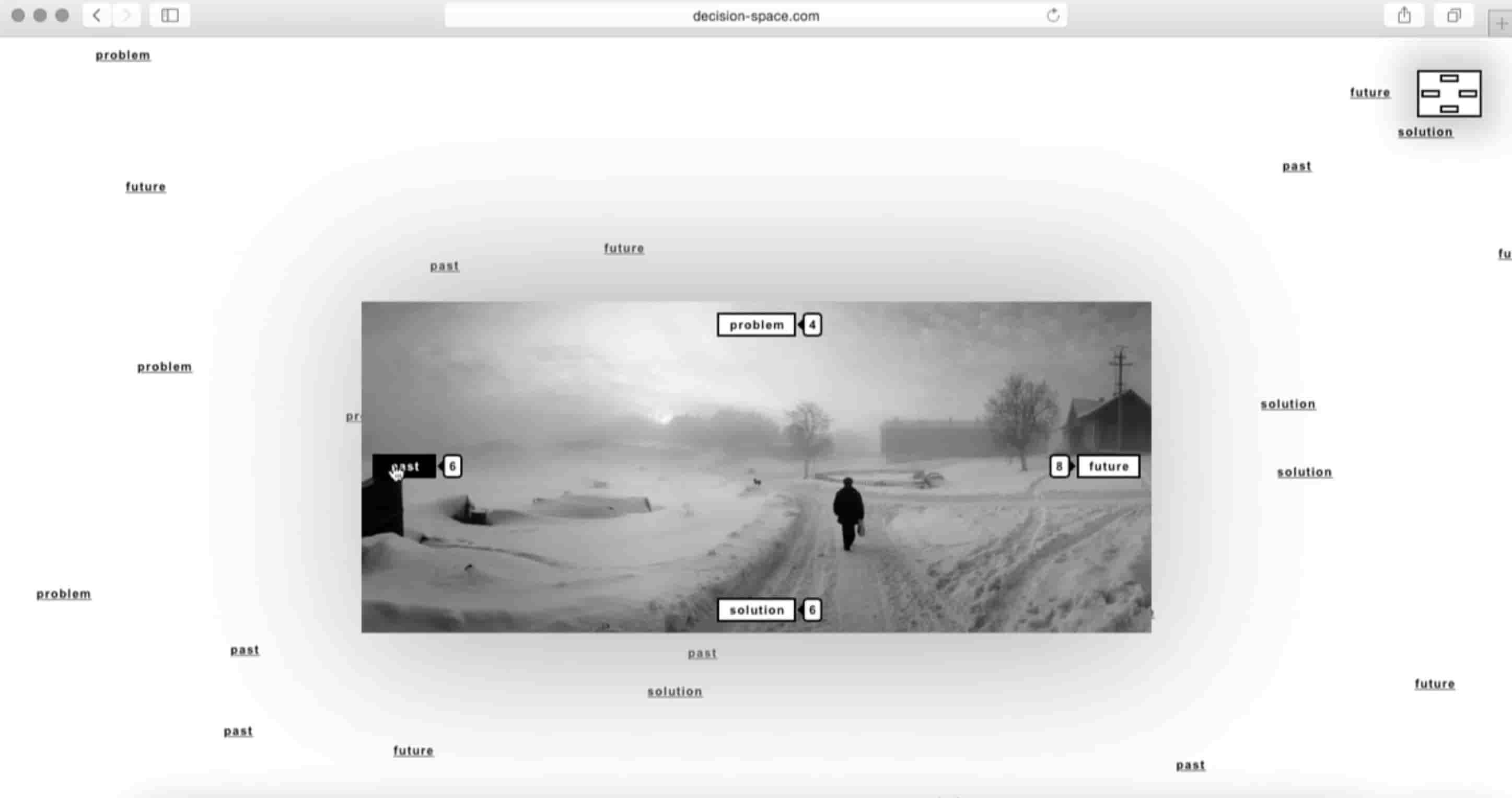 I came across this project called "Decision Space" that is used as part of The Photographers' Gallery website. The project raises questions around photography, big-data, surveillance, the hidden manual labor behind artificial intelligence and the biases embedded in algorithmic systems.Visitors were invited to assign all the images available on the gallery’s website to one of four categories: Problem, Solution, Past and Future, without any context given other than the images.