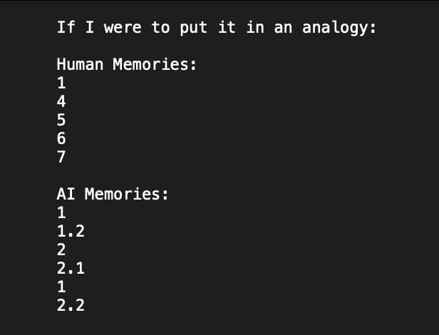 Although its pretty clear that I wanted to differentiate between human and machine memory, the discussion I had with Andreas reminded me of the point I had and should focus to move forward. My point? To simplify it, machine learning models can only mimic human abilities, and they are unable to understand what an experience is unlike how human experiences tied to emotional and subjective understandings.