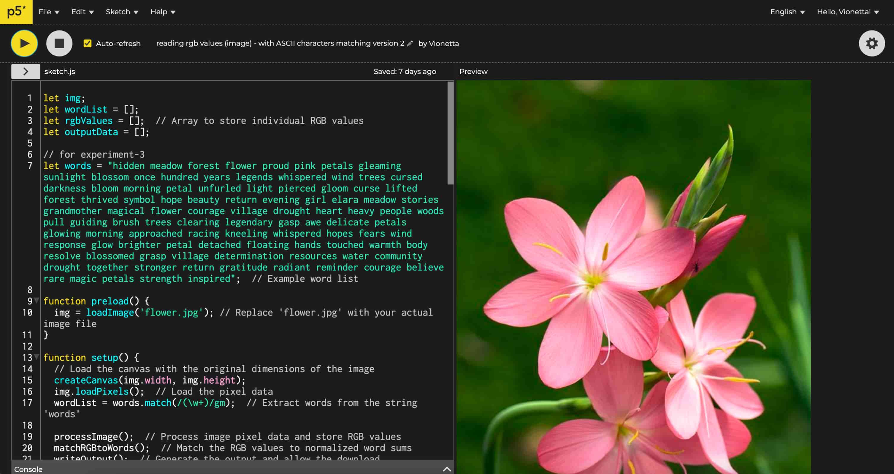 I created a website where people can create their own poems using images. They can upload any image and write words or sentences that describe it, and the site generates an output similar to mine. People can also download the output as text file if they want to keep the poem. It's a fun way for others to create poems using pixel data!