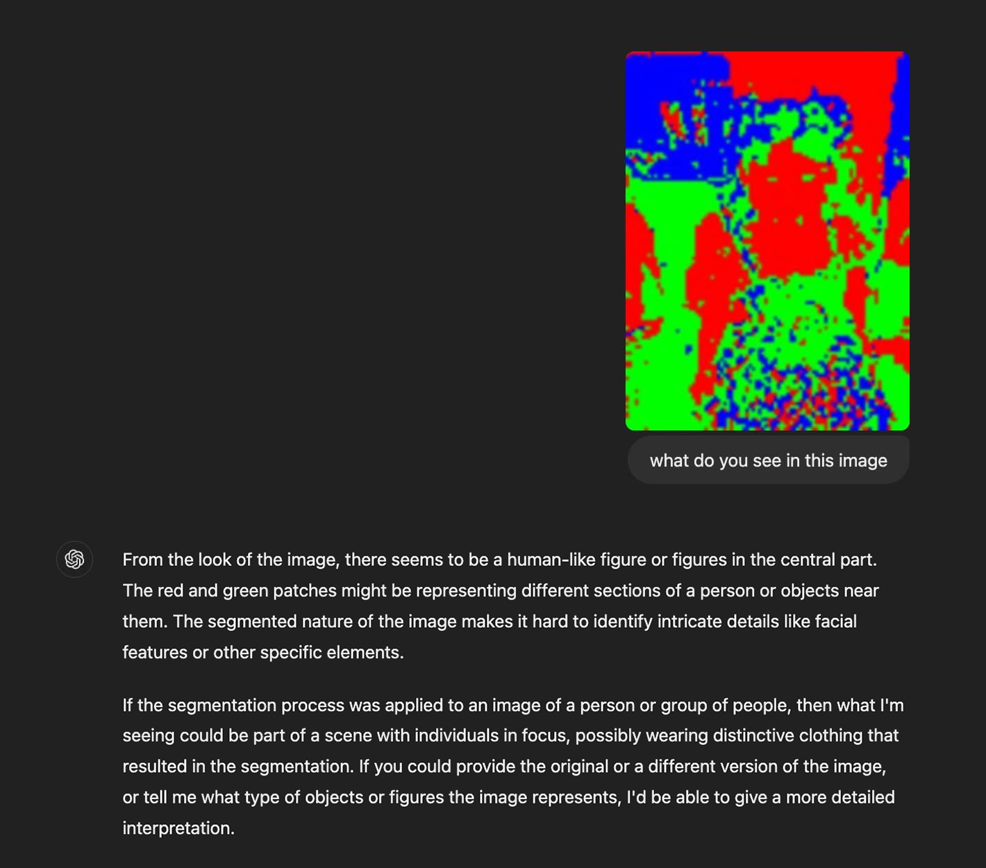 The goal of this experiment was to see what details the segmentation process includes or not, as interpreted by ChatGPT. Since I’m using a basic segmentation technique (a foundational approach compared to those used in complex machine learning tasks), it’s easier to test a machine learning model’s ability to interpret what it "sees" through this pixel data, particularly as the results are quite abstract.
