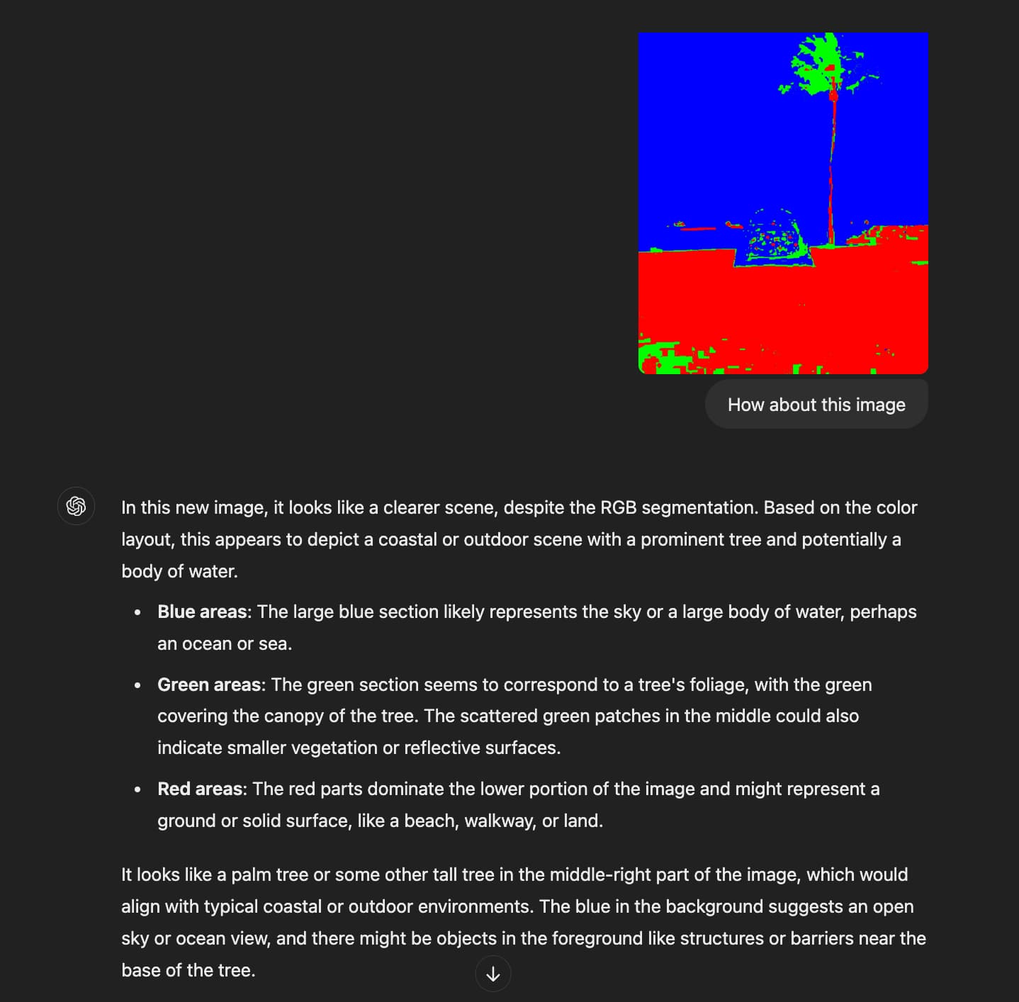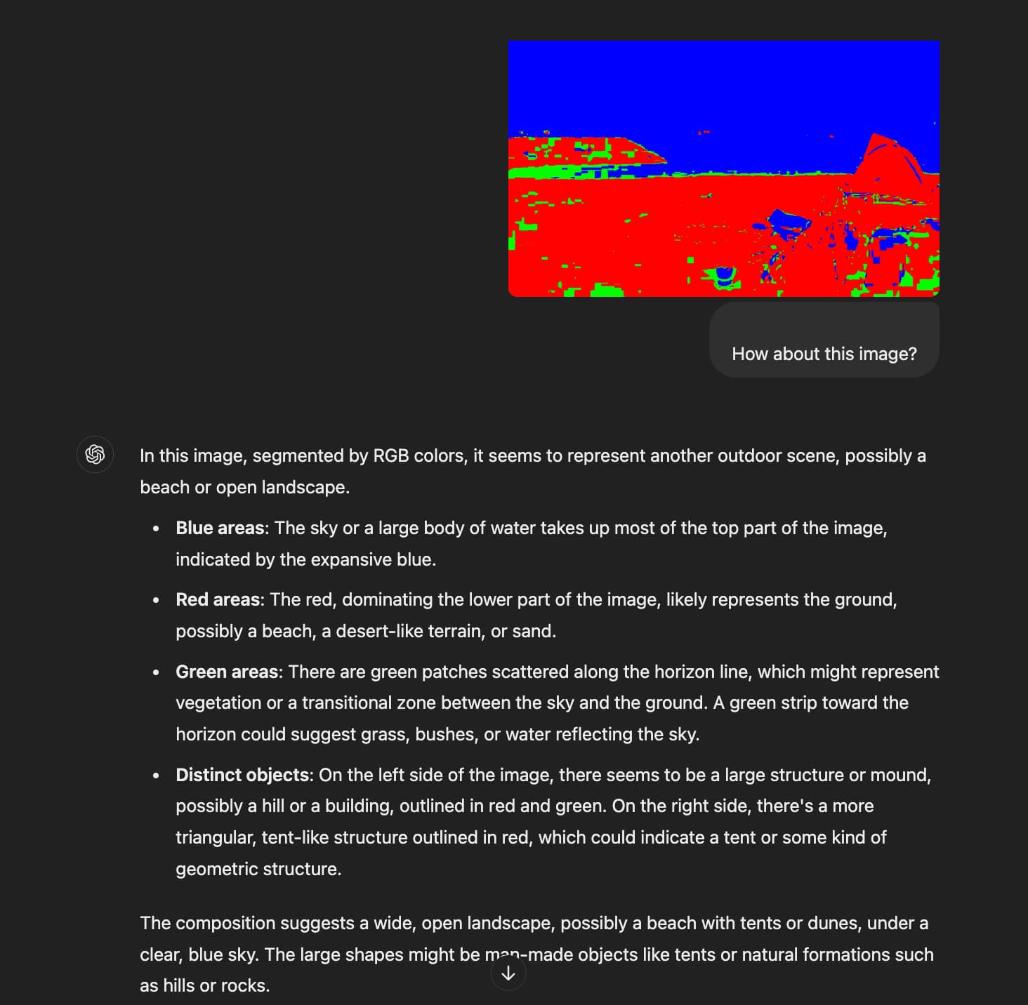 If the image contains various shades of red, green, or blue, the code groups all similar shades into one of these three reference colors, simplifying the image to red, green, and blue segments. I tested this approach on three different images, each has different objects. The resulting segmented images were then fed to ChatGPT to analyze its interpretation based on these color segments.