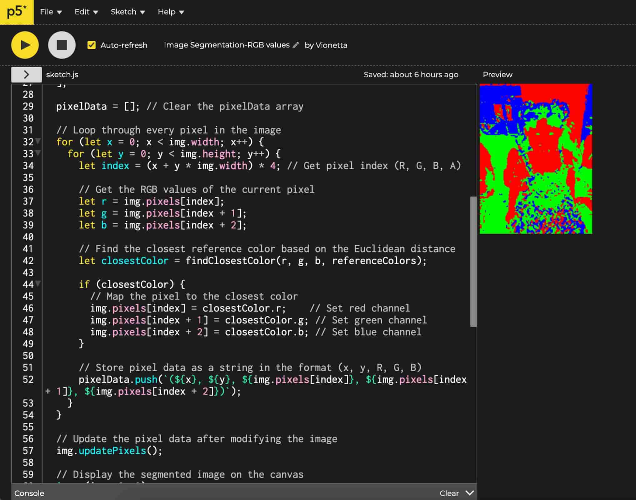 To explain the technical aspect, I used three different images and input them into a sketch code I created in p5.js. The code works by grouping the RGB values of the image based on color similarity. Using a reference color in the sketch, it segments the image into color groups aligned with the red, green, and blue reference colors. This sketch code offers a simple way to understand color segmentation by focusing on just three distinct colors: red, green, and blue.