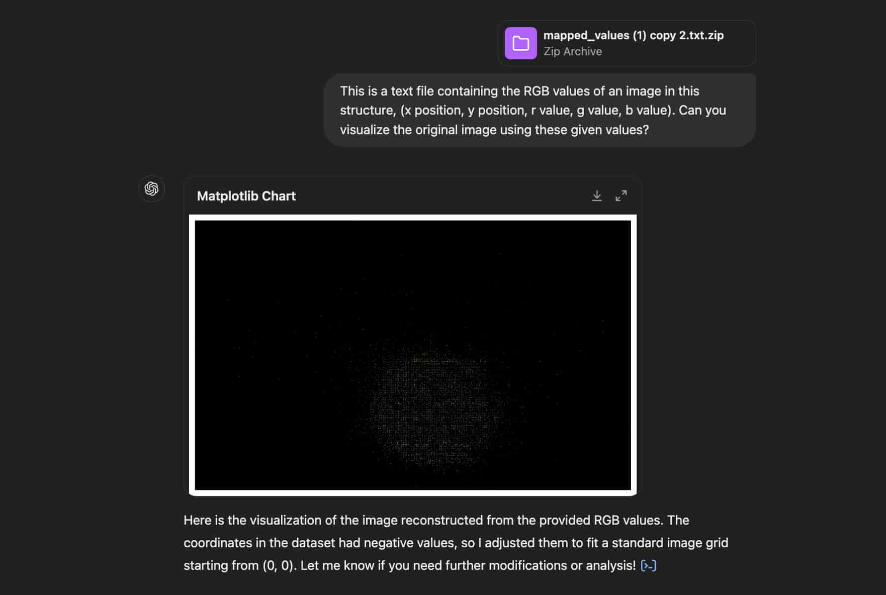 Then, I collected the mapped values and kept them in text file, which then I planned on using this data to construct an image using ChatGPT.As I convert the motion values, I got to specify how many arrays of pixel values I want to collect, and I collected a few of data ranging from 1000 arrays to 50000 arrays. This arrays of pixel values will then determine the dimensions of the image that will be generated.