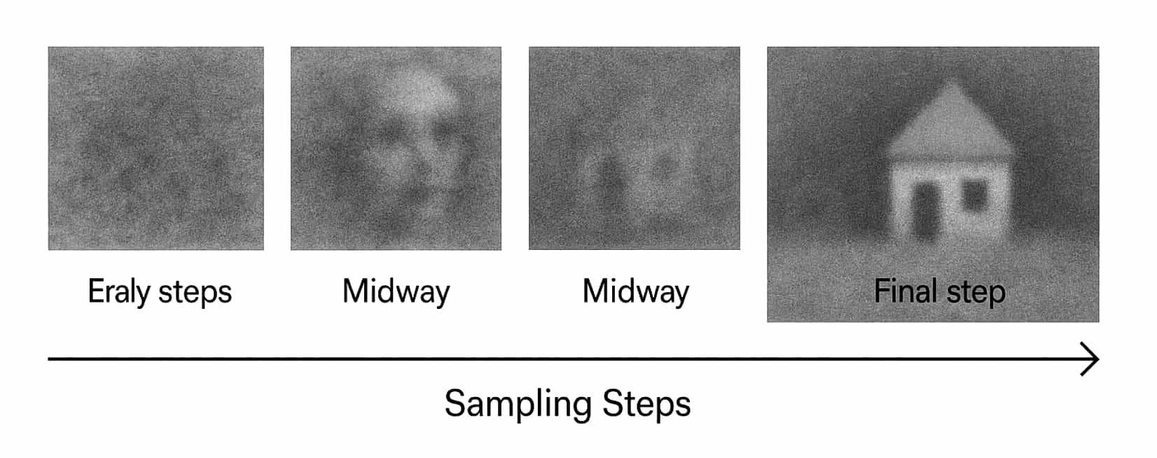 The images shown in the early steps may not make immediate sense, but they sometimes reveal haunting visuals, like the figure of a face that feels ghostlike or smooth gradients that form naturally. These are glimpses of the AI’s evolving process, captured just before the final image takes shape.