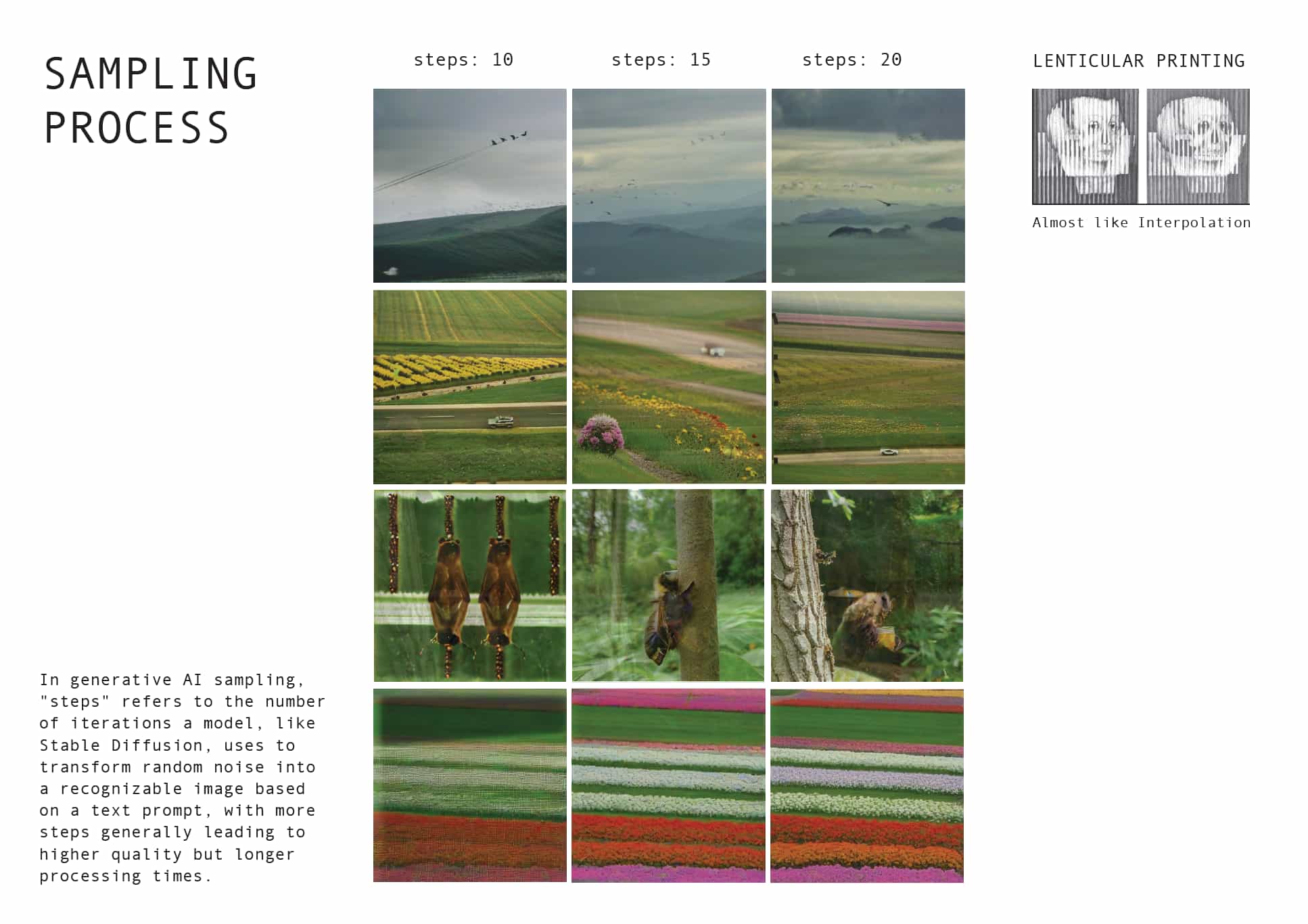 When the AI generates an image from the prompt, it doesn’t begin as a simple outline, but rather it starts from a pure nose, like TV static. Imagine the steps parameter in the sampling process functions as more like a staircase for the machines to take, for it to reach the final destination, which is the final image generation.