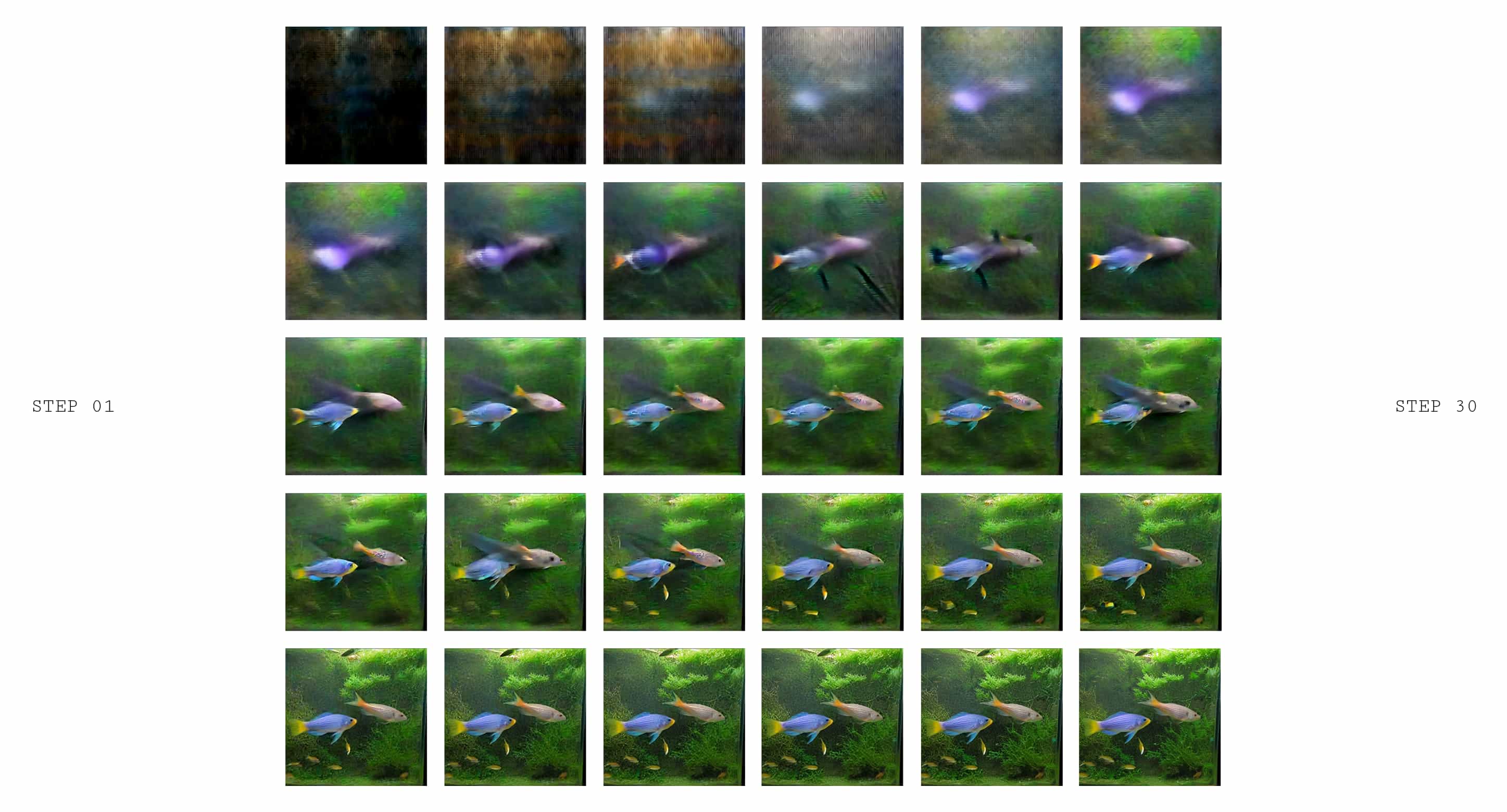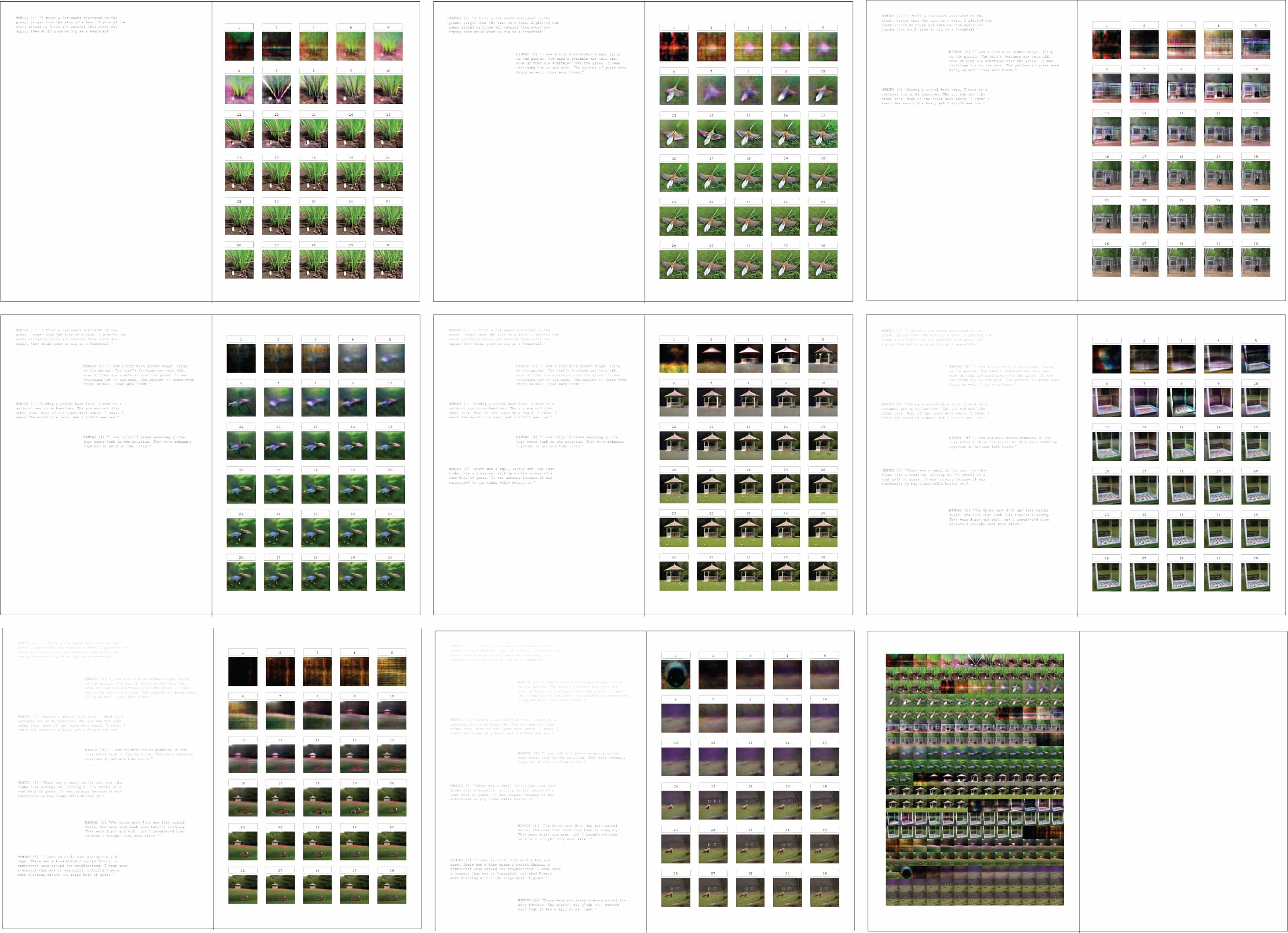 I inputted 8 memories, 8 written prompts to produce the images generated within 30 steps of sampling process. They show the live process of the machine polishing the image from a random noise to a clear visual. Each image is generated using a blend of prompts that accumulate across iterations. Traces of earlier prompts still linger, such as a fish that was meant to be swimming in a tank now appearing among blades of grass.