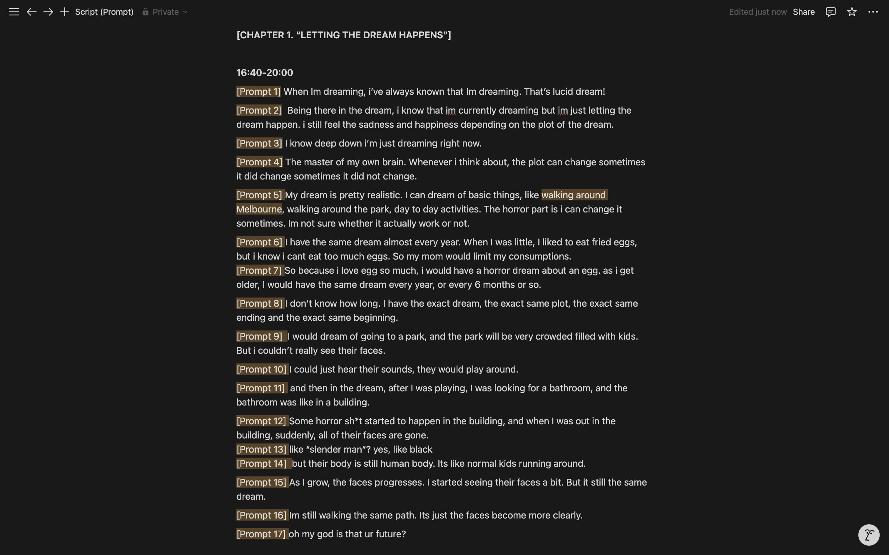 As I recorded and played back these conversations, I noticed how differently each person recalled their memories. Some were more descriptive, while others were more emotional, focusing on how certain memories shaped their present selves. We began with simple topics, like recalling a dream we had shared with others, and the conversations gradually shifted to deeper subjects — first core memories, experiences like receiving our first detention, moving into adulthood, and uncanny, bizarre moments that changed our perceptions of life.
