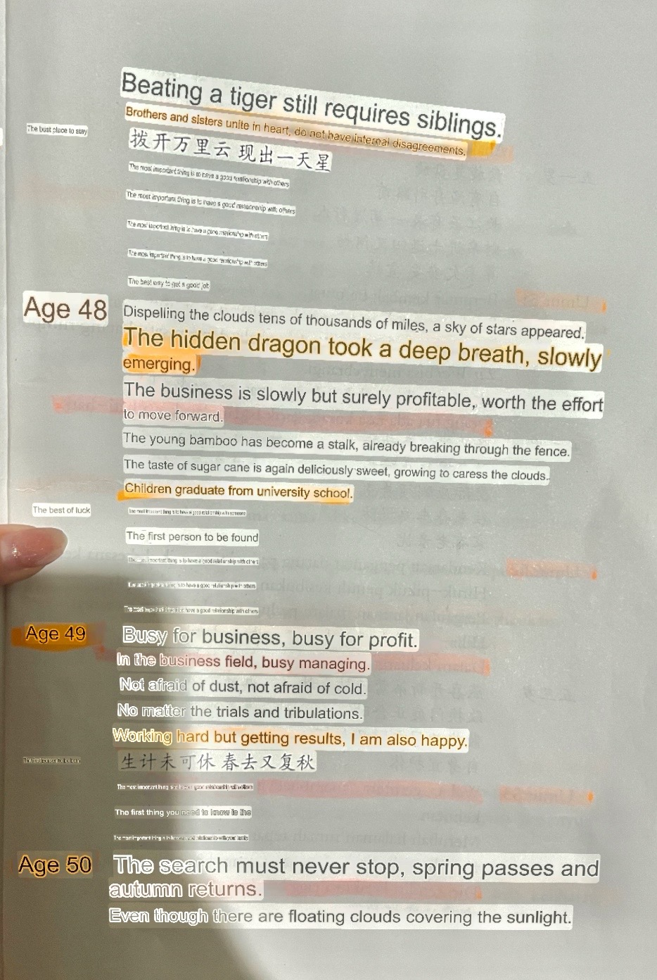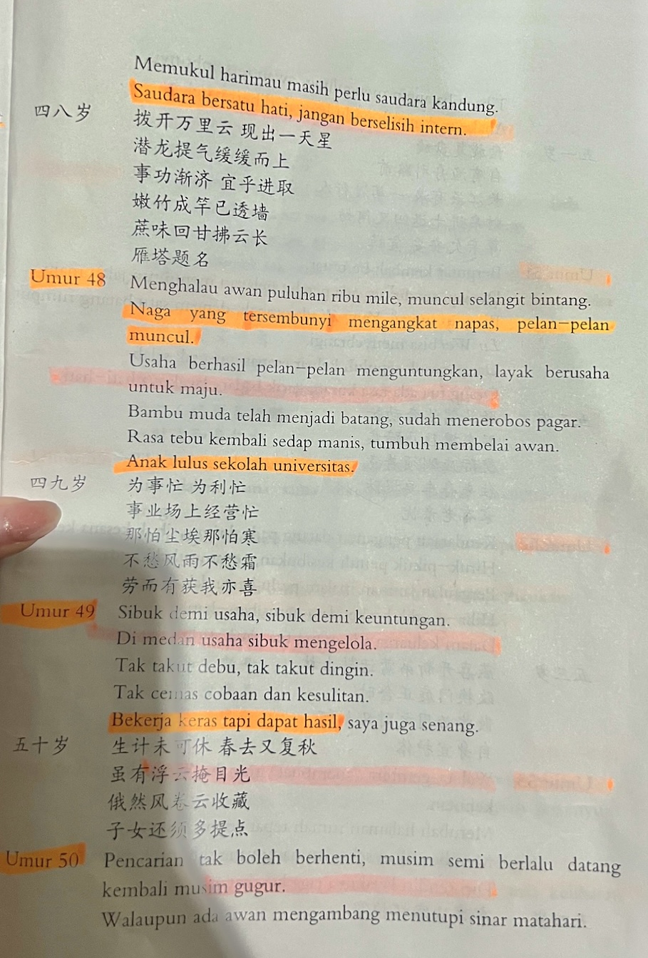 To explain the relationship between fragments and imagination better, I have a good example — a book that is full of experience when you read it occasionally. There was this book that my father has that comes from fortune telling that shows his age line, almost like a book of life. It shows his life journey, past and future, with each year labelled with his age. Each year tells a story, an event, or at the same time a reading (message). However, these messages are written in poems, using abstract words that are mostly metaphors.