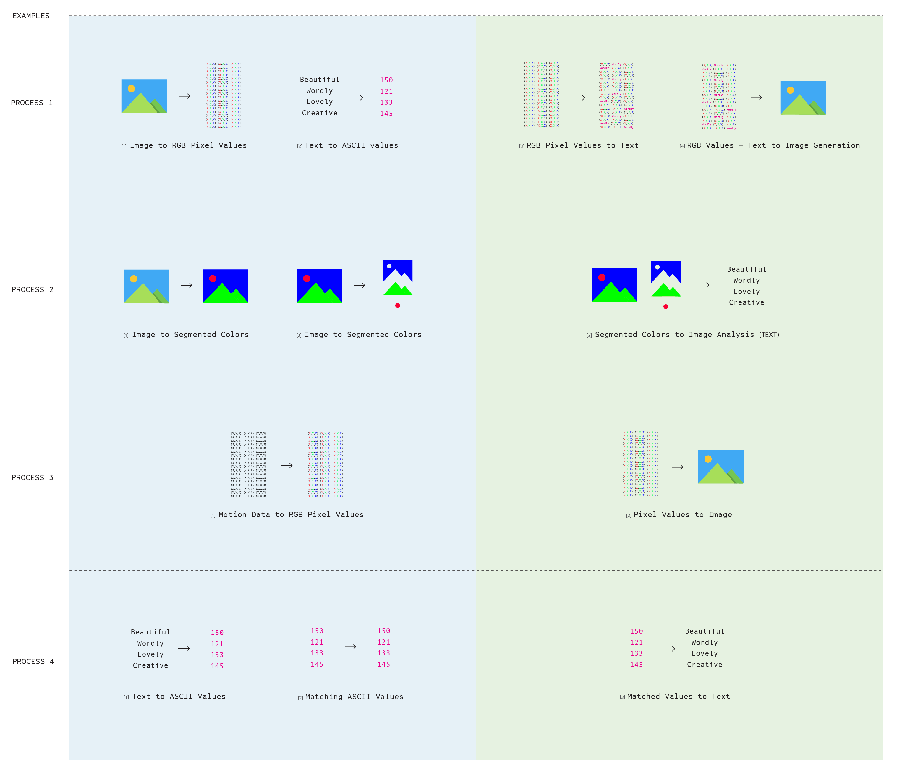 I spent time reflecting on the processes behind my experiments and noticed recurring patterns throughout. These processes often involve converting, deciphering, and reconstructing, which are techniques that are similar to the methods of encoding and decoding used in image processing.