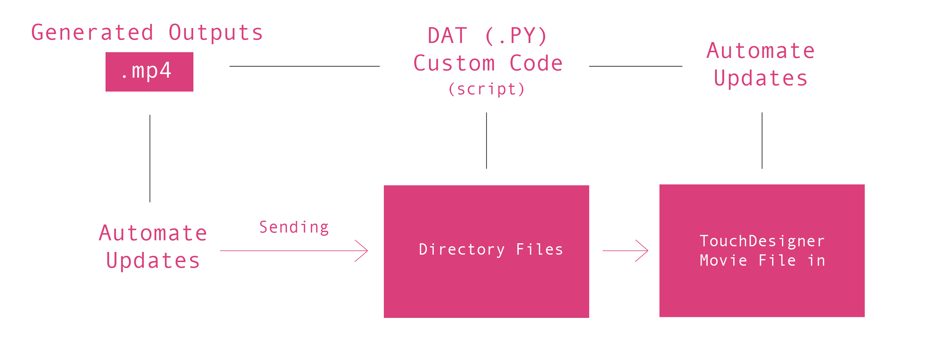 If I wanted to use TD just for its efficient interface to display the outputs without the workflows being visible, I was thinking that perhaps I could connect the visual outputs as DAT file (Operator in TD) through a directory file. The plan was to create a custom code using the DAT operator, and it will automatically updates the visuals as new visuals are generated and placed in the specific directory file. This would be a much simpler process rather than meddling with things that I have no clue about, and ended up destroying my laptop because of it.
