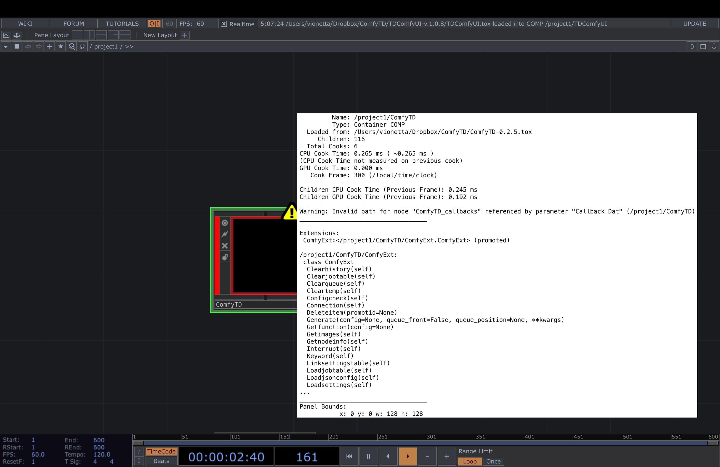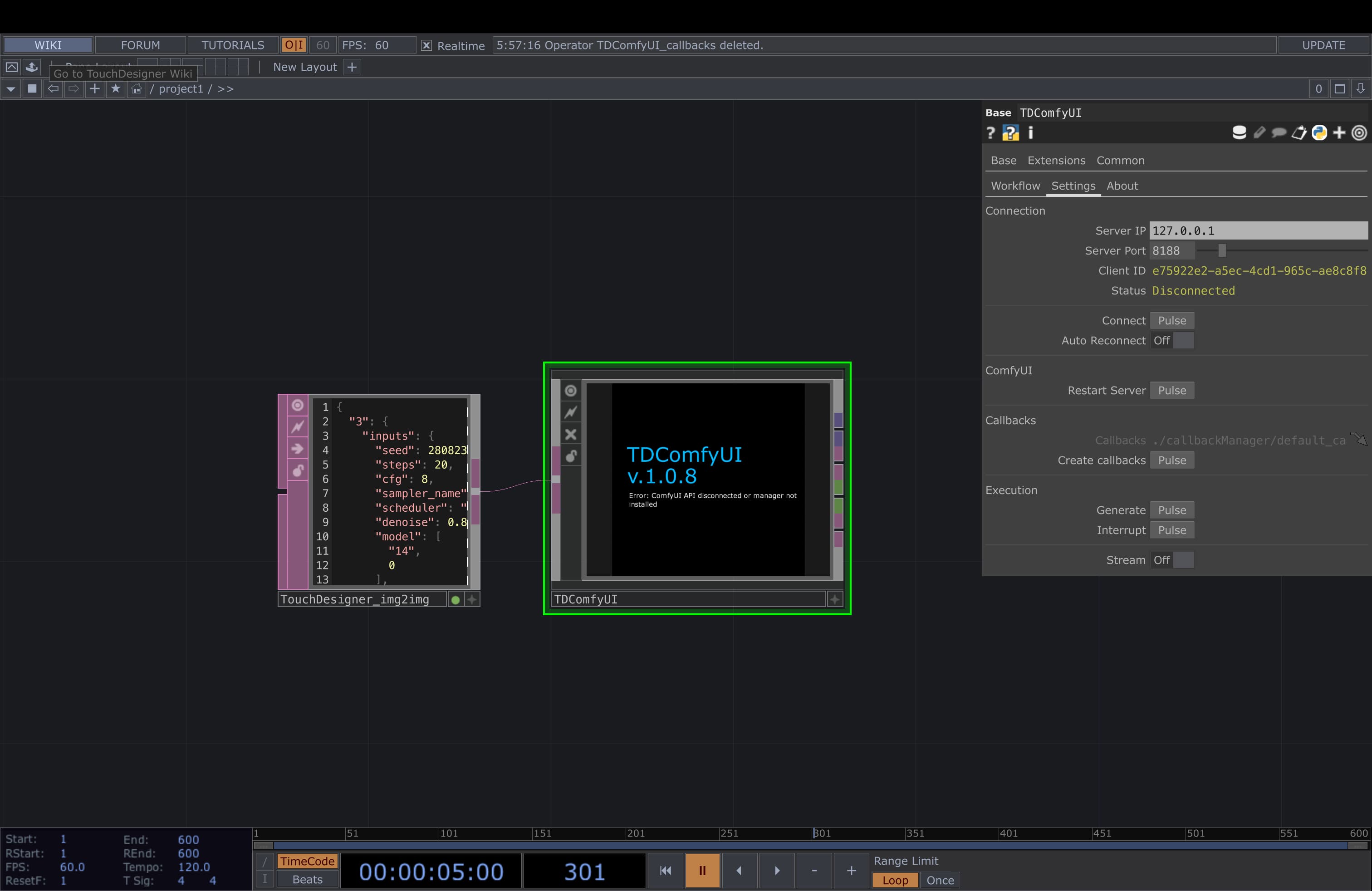 I tried using this extension resource downloaded from this artist’s Patreon. This extension allows you to send images and generate images from your comfyUI workflows to TD interface through API. It has controls parameters for the queue timing and lighter performance stability on the generation process.
