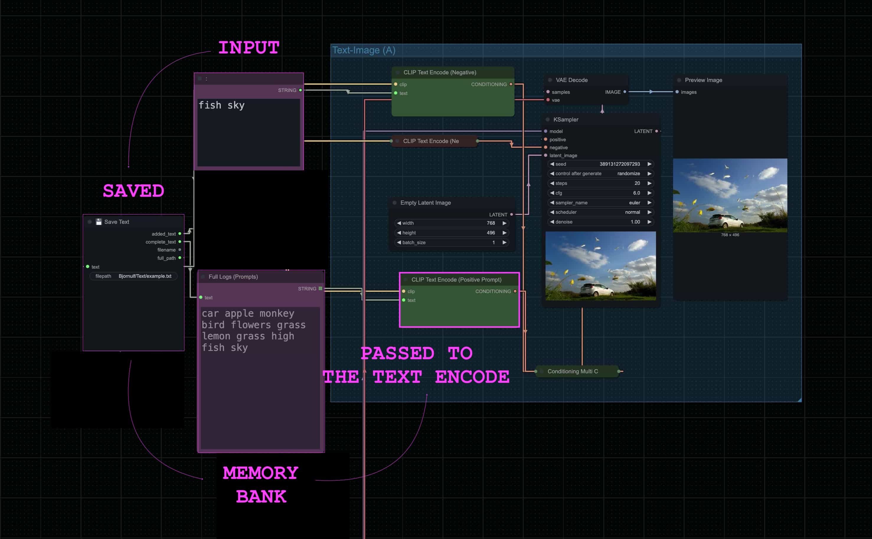 The next step is to create the memory bank, in which it functions to store every prompt that has been passed to the CLIP conditioning. To do this, I found a node that acts as a prompt stash, where it can passed the prompts as text strings and stored it as plain text in the text files.