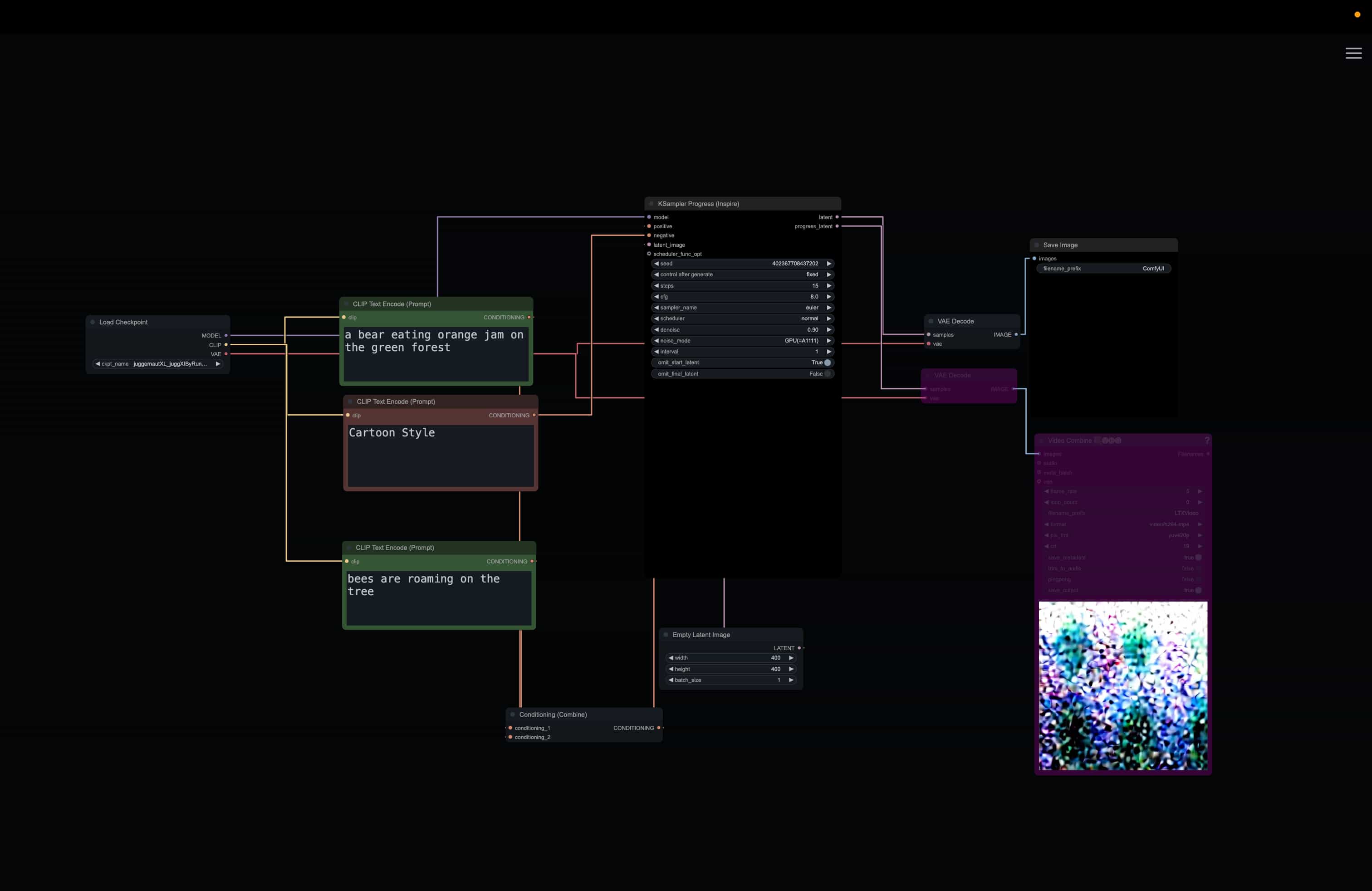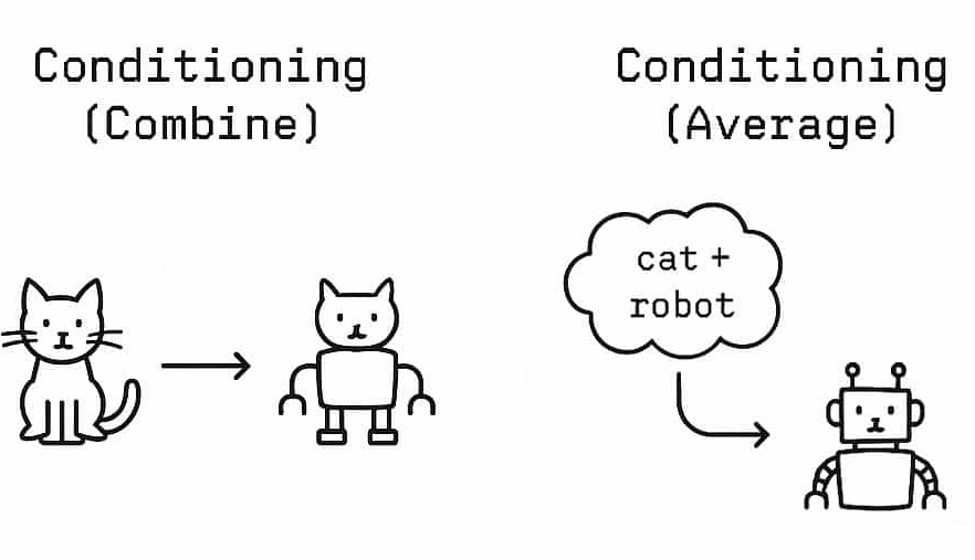 Imagine you're painting with help from two artists, one loves cats, the other adores robots. With Conditioning (Combine), each artist paints their own version of the scene, and then you merge the two paintings into one.