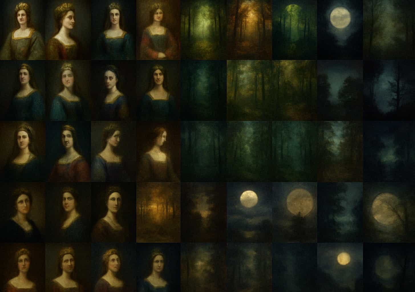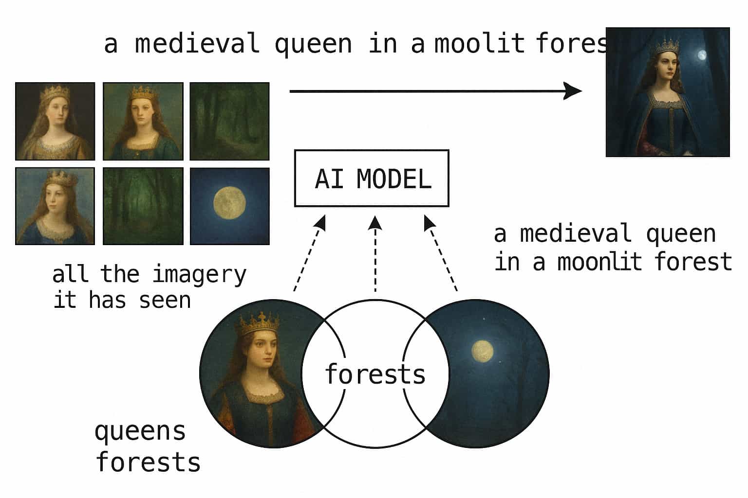 the model draws on all the imagery it has seen related to queens, forests, moonlight, etc., and then generates something that captures the essence or average vibe of those elements.
